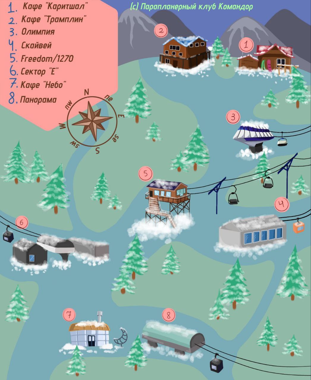 Полеты проходят в зимнее время года, с горы "Зеленая" сектор А и сектор Е. Перед полётом инструктор проводит инструктаж, затем при необходимости предоставляется камера GoPro и совершается полет.